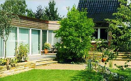 Der Zugang zur dem überdachten Teil der Terrassenanlage. Mauern und Stufen sind aus Sandstein gefertigt.