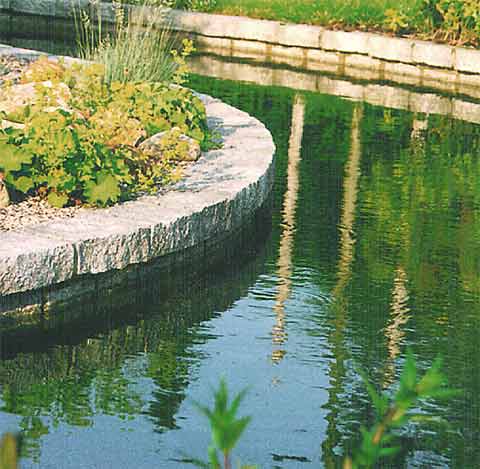 Die Insel ist über eine Brücke erreichbar. Auf ihr steht der Pavillon, den wir eigens für diesen Garten entworfen haben. Das Becken ist mit Naturstein ausgekleidet und beleuchtet. Durch die kreisrunde Form ergeben sich unglaublich vielfältige Blickwinkel. Aus jedem dieser Blickwinkel hat das Becken eine faszinierende Ausstrahlung