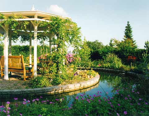 Kreisrundes Wasserbecken mit Insel und Pavillon