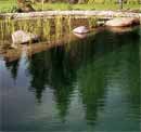 Der Schwimmbereich ist wie ein klassischer Pool gebaut und der umlaufende Flachwasserbereich erhielt eine natürliche Form. Die Wasserfläche erstreckt sich bis an das Haus. Von der Terrasse führt ein Steg in den Garten.